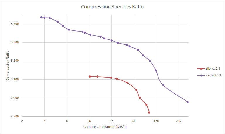 Zstd can also offer stronger compression ratio at the cost of compression speed. Speed / Ratio trade-off is configurable by small increment, to fit different situations. Note however that decompression speed is preserved and remain roughly the same at all settings, a property shared by most LZ compression algorithms, such as zlib. The following test is run on a Core i7-3930K CPU @ 4.5GHz, using lzbench, an open-source in-memory benchmark by inikep, on the Silesia compression corpus